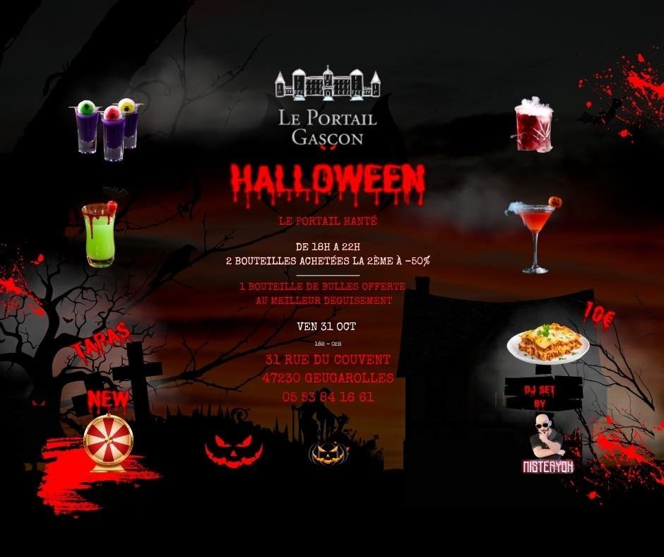 Le Portail Gascon propose une soirée Halloween déguisée et animée par un DJ Misteryon. De 18h à 22h, 2 bouteilles achetées, la 2ème à50% . Une bouteille offerte au meilleur déguisement.